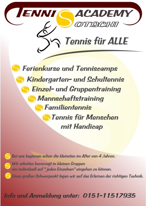 Seit 2011 arbeiten wir eng mit der Tennisacademy Sotschi zusammen, dadurch können wir ein noch besseres Training anbieten und der Erfolg gibt uns recht. Aktuell werden alle Kinder und Jugendlichen